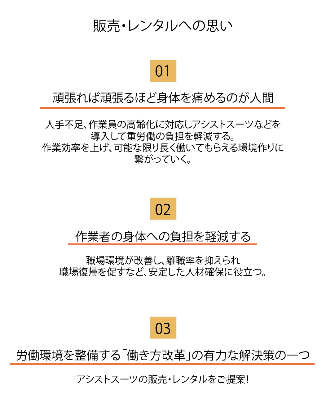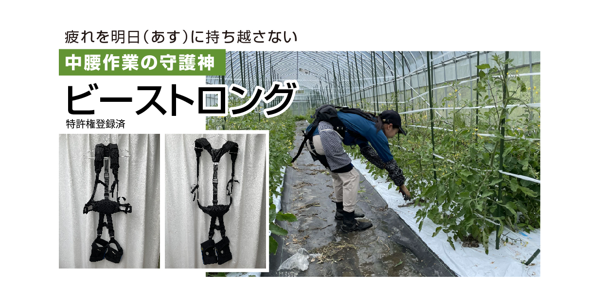 腰と脚の補助を目指して身体に優しいアシストスーツの 製造と販売を行っております。高齢化時代の中で誰でも 簡単に装着できて健康寿命を延ばすことができます。 中腰作業時の腰の負担を軽減する”ビーストロング” 歩行時の補助をする”ラバラック” 農業物流センター介護施設等でお役に立ちます。 農水産省のHPアシストスーツに掲載しています。 販売とレンタルをしていますのでお気軽にお問い合わせください。
